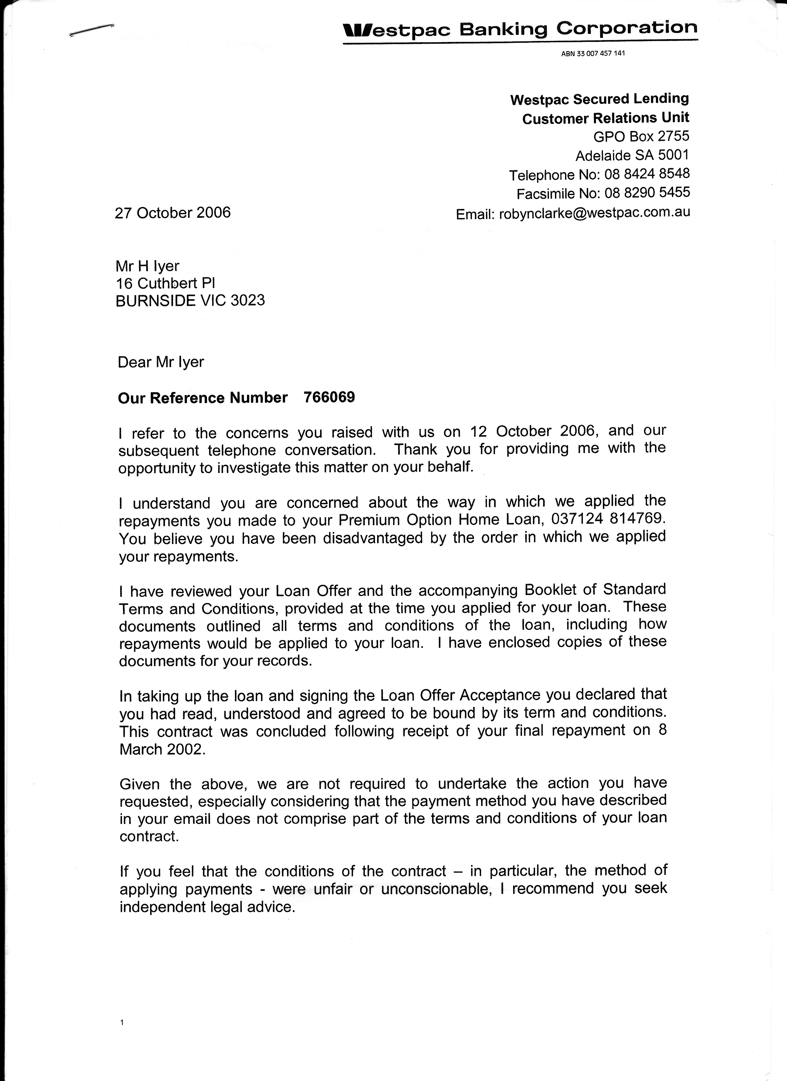 No one contacted me from NAB. Mr Alejandro Young's reply, dated 19th Dec 2006 (proving the arrogance not to go by Ombudsman's deadline). Alejandro is a higher level officer than Anthony Thompson. Since Ombudsman system itself is only a 'dispute resolution mechanism' maintained and paid by the Banking industry, how can ombudsman give regulatory instruction?